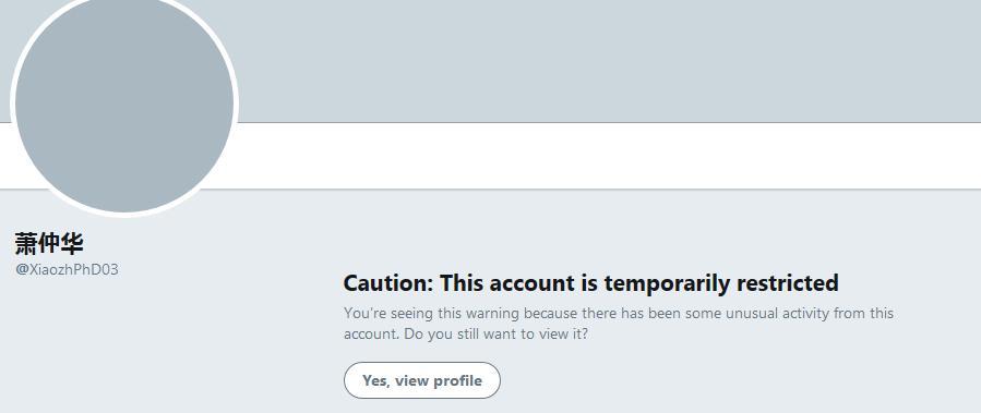 肖大五毛在其旧推号惨遭橄榄后,一瞬注册了新的推号@XiaozhPhD03,然而新的推号却再次被官方橄榄,,,