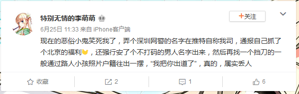 | 名言警句 | 现在的恶俗小鬼笑死我了,弄个深圳网警的名字在推特自称我司,通报自己抓了个北京的福利🐔,还强行安了个不打码的男人名字出来,然后再找一个挡刀的一般通过路人小孩照片户籍往出一摆,“我把你出道了”,真的,属实丢人 |